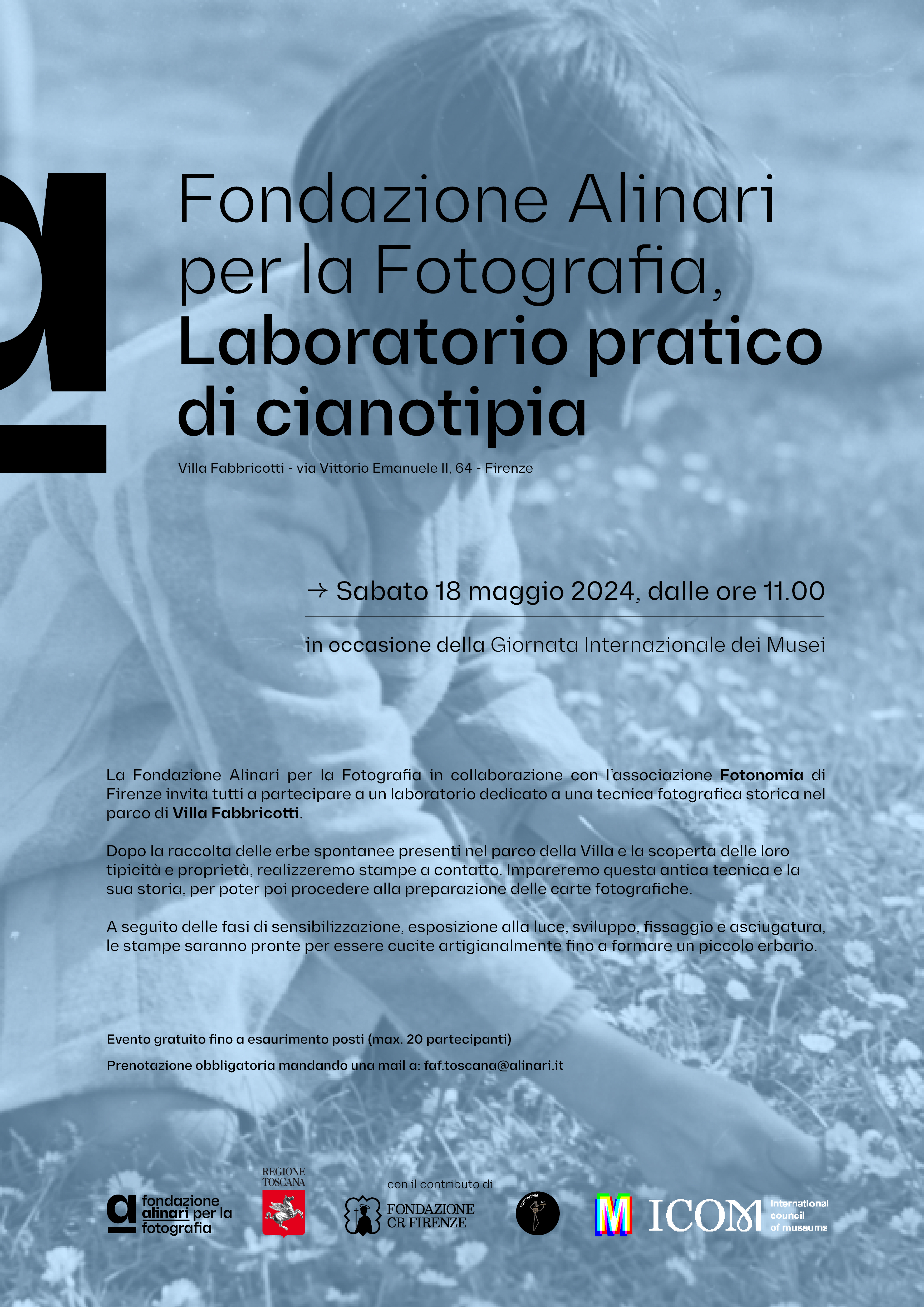 On Saturday, May 18, 2024 at 11:00 AM at Villa Fabbricotti (Via Vittorio Emanuele II, no. 64, Florence), on the occasion of the International Museum Day 2024 organised by ICOM - International Council of Museums, Fondazione Alinari invites you to take part in the CYANOTYPE WORKSHOP, in collaboration with Fotonomia association and thanks to the contribution of Fondazione CR Firenze.